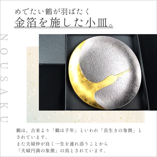日本で古来から長寿の象徴とされている鶴をあしらい、金箔を施した錫100%の小皿と豆皿のセットです。
